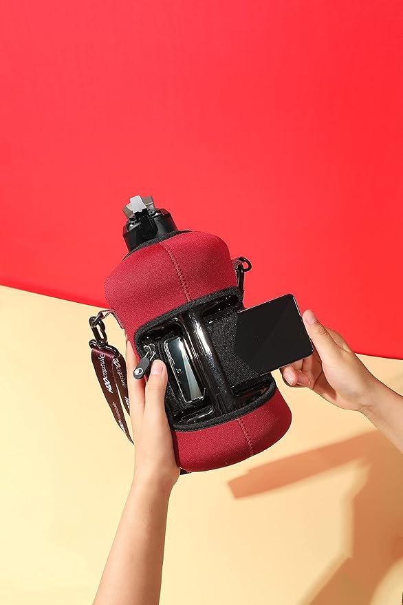 - UNIQUE STORAGE SLEEVE: Using the space under the large jug handle to store your stuff, the patent-pending removable thermal sleeve has a unique design that holds your cards and cell phone, and is finished with an in-built key chain and removable shoulder strap for convenient hands free carrying! It’s the only encased water jug that holds your things while you exercise.