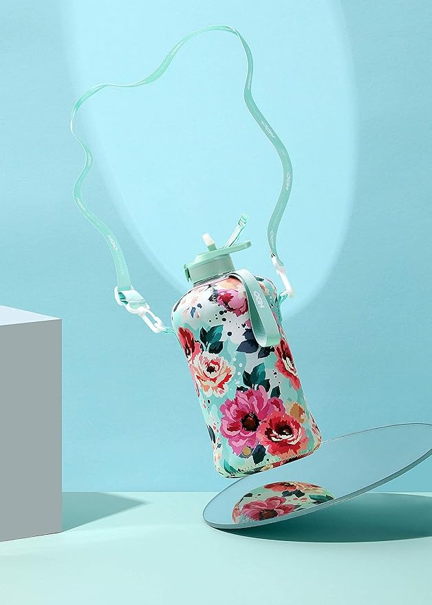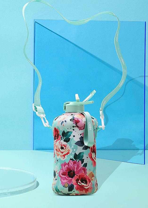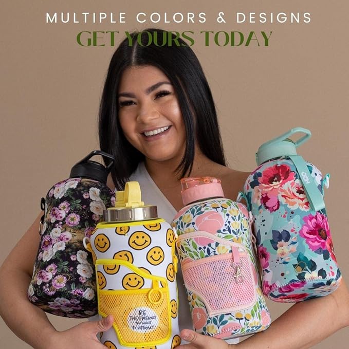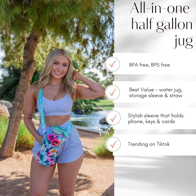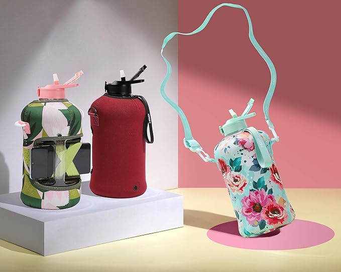 - UNIQUE STORAGE SLEEVE: Using the space under the large jug handle to store your stuff, the patent-pending removable thermal sleeve has a unique design that holds your cards and cell phone, and is finished with an in-built key chain and removable shoulder strap for convenient hands free carrying! It’s the only encased water jug that holds your things while you exercise.