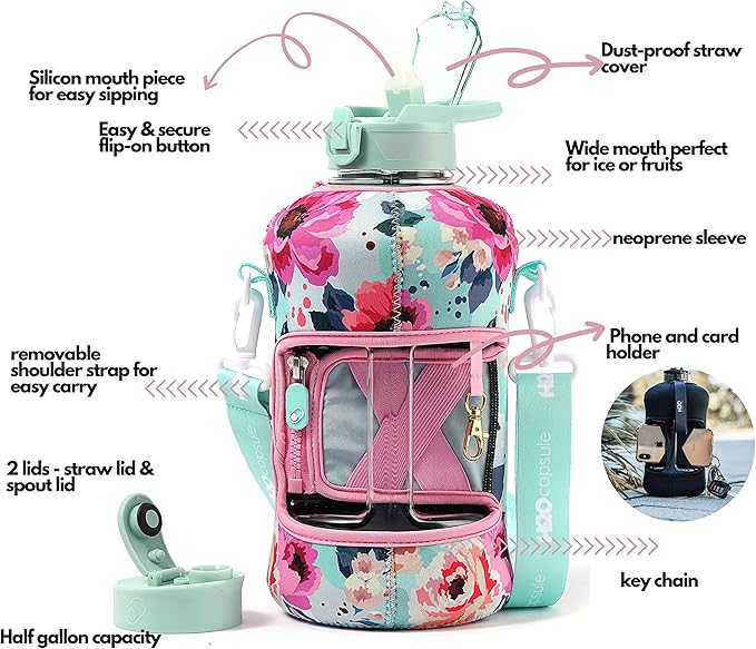 - HALF GALLON HYDRATION WITH COVERED STRAW LID: The extra large 2.2L / 74 oz plastic jug holds all the water you need to stay hydrated while you exercise. The reusable half gallon comes with a leak-proof & dust-proof covered straw lid, which helps protect the mouthpiece and flips open with a click of a button. The straw-lid is air-sealed: Run straw brush through mouth piece before initial use. The H2O Capsule bottle with storage sleeve comes with a bonus straw cleaning brush.