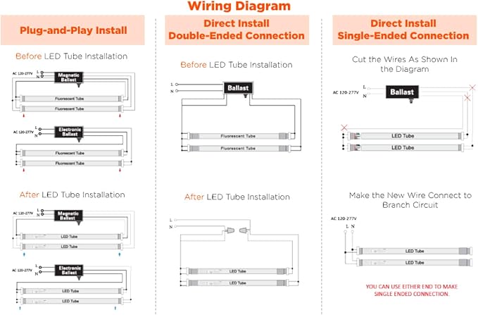 - These type A+B hybrid tube lights can be easily installed with existing ballast (plug-and-play) or by bypassing the ballast (direct wiring). They support both single & double-ended wiring connections and work with shunted and non-shunted sockets.