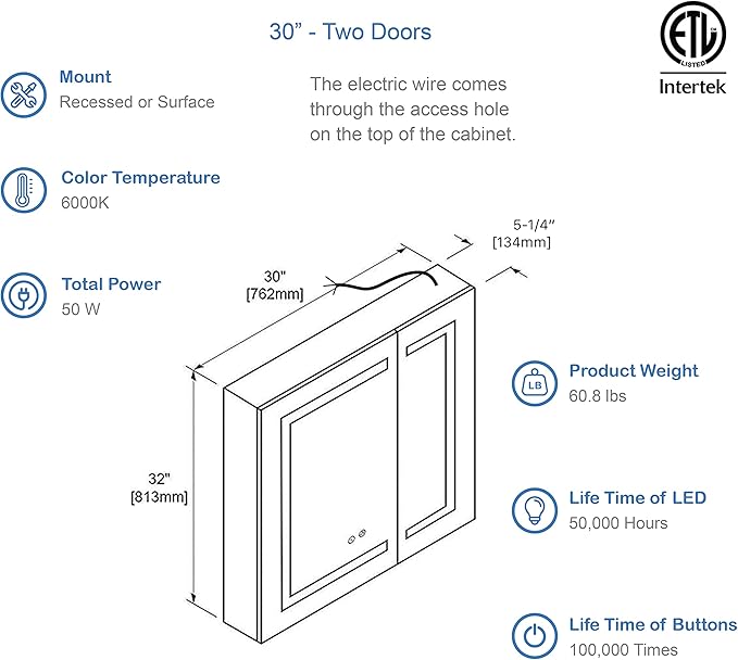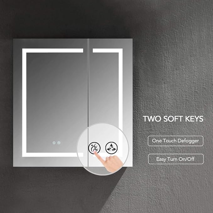 - Long-Lasting & High-Quality Build: Built for durability, this medicine cabinet mirror features LED lights with a 50,000-hour lifespan for years of reliable use. The soft-close hinge and concealed finger-pull door minimize noise and prevent slamming. With a 100,000 switch touch lifespan, the bathroom wall cabinet ensures long-term functionality and ease of use.