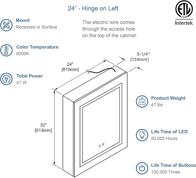 - Long-Lasting & High-Quality Build: Built for durability, this medicine cabinet mirror features LED lights with a 50,000-hour lifespan for years of reliable use. The soft-close hinge and concealed finger-pull door minimize noise and prevent slamming. With a 100,000 switch touch lifespan, the bathroom wall cabinet ensures long-term functionality and ease of use.