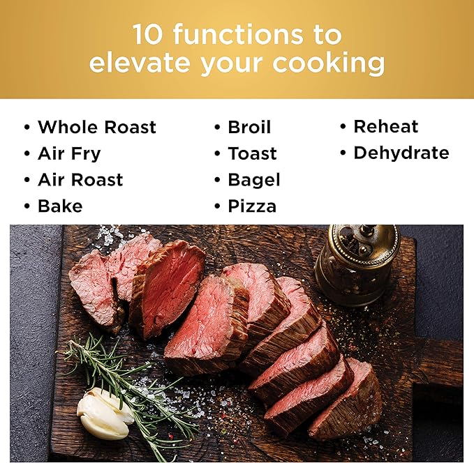 - 10 VERSATILE FUNCTIONS: Air Fry, Air Roast, Bake, Whole Roast, Broil, Toast, Bagel, Dehydrate, Reheat, and Pizza, all in one powerful 1800-watt appliance.