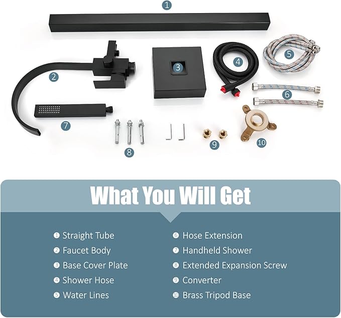 - 【What's Included】standing bathtub faucet body, brass faucet tube, handheld shower, cold and hot hose, base cover, mounting hardware and installation instruction.