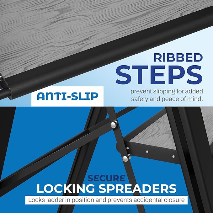 - Anti-slip ribbed steps for added security and slipping prevention, the steps are made from high quality brushed aluminum, providing strength and style. Rubberized feet keep the ladder from slipping and prevents your floor from getting scratched during use. Extra-large, oversized top platform provides a safe, stable and comfortable place to stand and eliminates fatigue