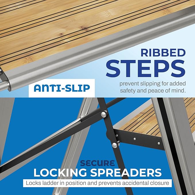 - Anti-slip ribbed steps for added security and slipping prevention, the steps are made from high quality brushed aluminum, providing strength and style. Rubberized feet keep the ladder from slipping and prevents your floor from getting scratched during use. Extra-large, oversized top platform provides a safe, stable and comfortable place to stand and eliminates fatigue