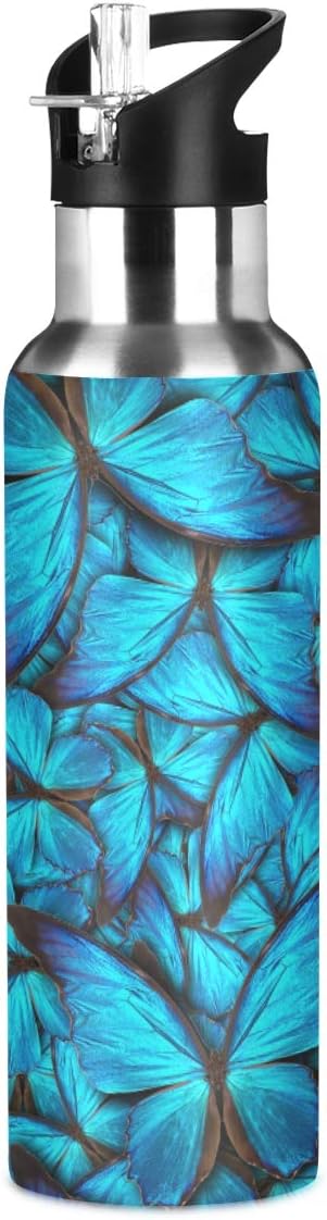 Blueangle Blue Butterfly Water Bottle with Straw Lid for Fitness Gym Camping Outdoor Sports, Wide Mouth Vacuum Insulated 18/8 Stainless Steel, 22 oz