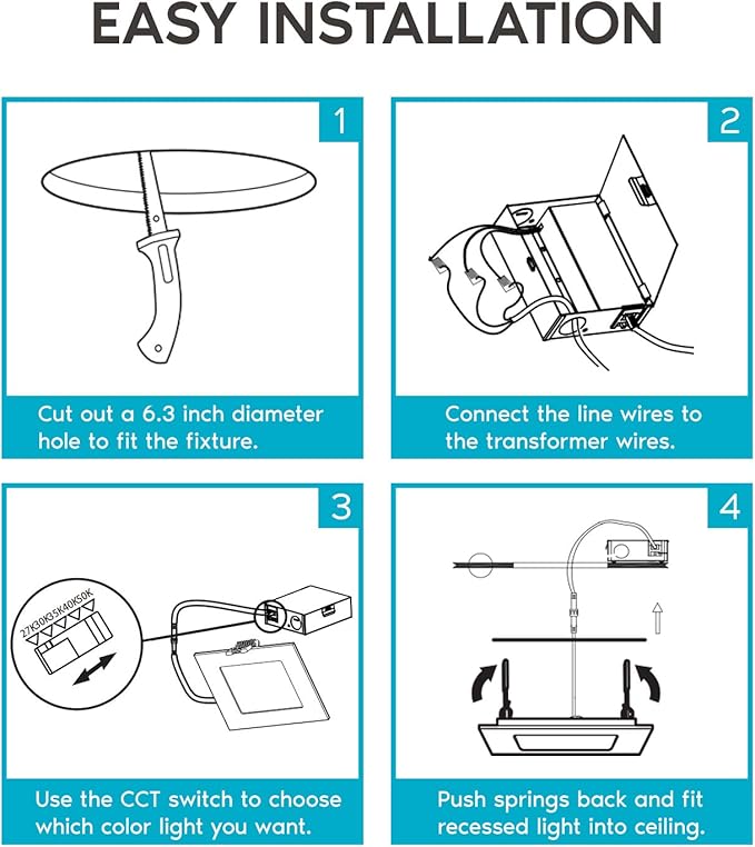 - 5 Color Options - Not sure what color temperature you are looking for in your home when using LED recessed lights? Each 6 inch square LED ceiling light has a simple to use switch connected to the junction box that can change your lights to 2700K warm white, 3000K soft white, 3500K natural white, 4000K cool white, or 5000K bright white. Your home wafer lights will be adjustable through 5 color temperatures until you find the perfect light to select for your space.