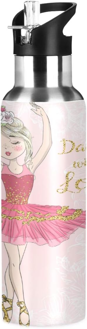 Blueangle Lovely Ballerina Girl Sports Water Bottle, 22 Oz BPA Free Non-Toxic Stainless Steel Water Bottle with Straw for Gym Yoga Fitness Camping