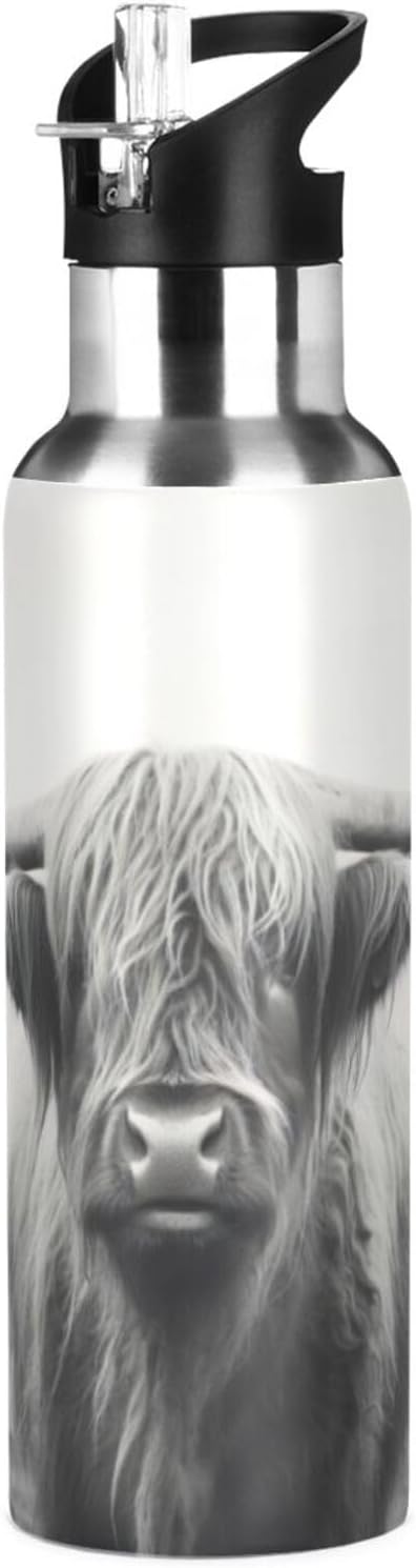Funny Scottish Highland Cow Water Bottle - Reusable Water Bottle for Gym Bike Running Cycling 600 Milliliter 22 Ounce Stainless Steel Sports Water Bottle