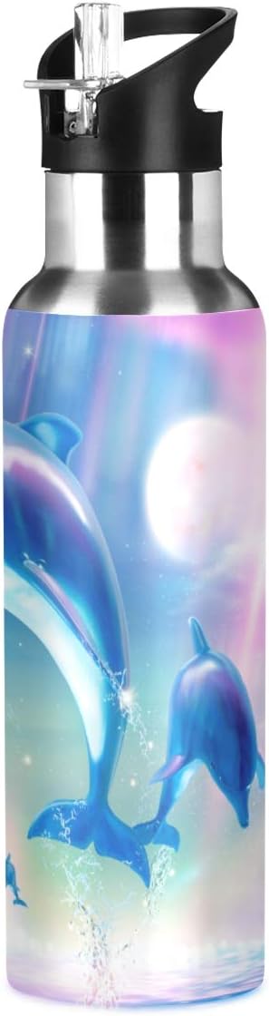 22 OZ Lovely Dolphins Water Bottle with Straw - BPA Free Leakproof Stainless Steel Water Bottle for Women Men Water Jug for Fitness Gym Outdoor Sport