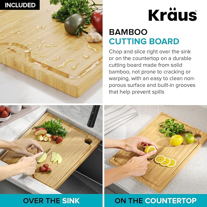 - DURABLE BAMBOO CUTTING BOARD with built-in drainage grooves and non-porous surface, not prone to cracking or warping – Stainless steel ROLL-UP DISH RACK with non-slip silicone; dishwasher-safe, heat-safe, rolls up for storage – BLACK STAINLESS STEEL BOTTOM GRID in matching PVD Gunmetal finish keeps dishes elevated for better draining, protects sink surface from scratches and dents – DRAIN ASSEMBLY W/ COVER helps keep the drainpipe clear, creates a clean look with matching finish