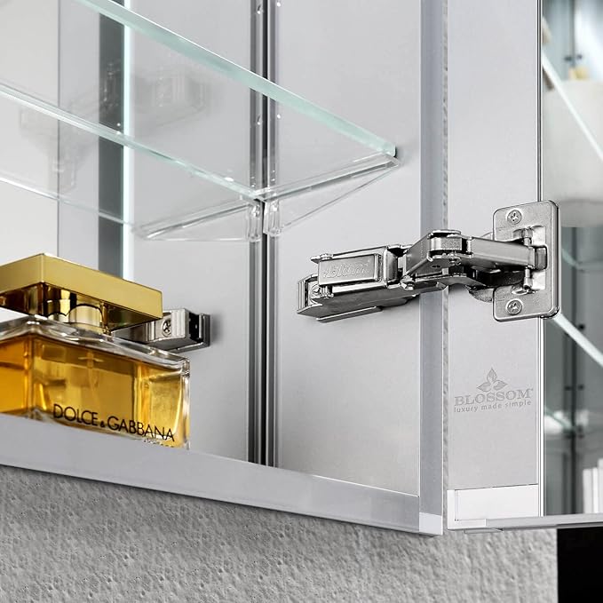 - Premium Mirror & Frame Construction: This lighted bathroom medicine cabinet is designed with a full mirrored interior and exterior, and a copper-free silver mirror front that resists black spots and oxidation. The tempered glass is treated with an anti-black coating for enhanced clarity, while the anodized aluminum frame provides a sleek, scratch-resistant, and corrosion-resistant finish that’s built to last.