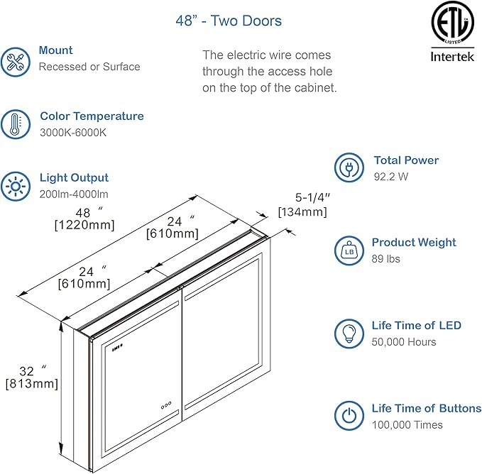 - Long-Lasting & Versatile Installation: The LED light has a lifespan of up to 50,000 hours, and the touch control is tested for 100,000 uses. Offers dual mounting options—can be surface-mounted or recessed into the wall—for a clean, seamless integration into any bathroom layout.