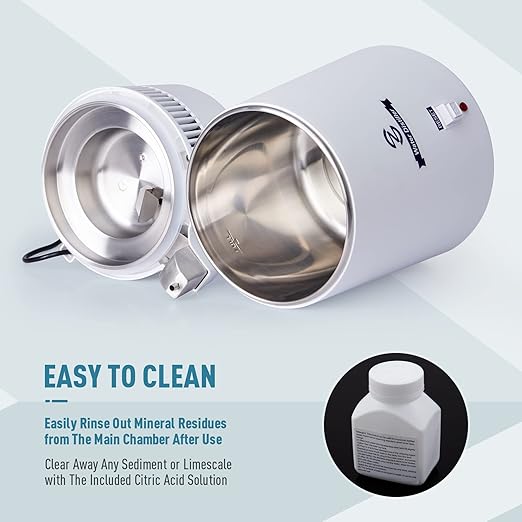 - XL HOME DISTILLER: This CO-Z countertop distiller holds up to 1.6 gallons of water, which its 900W heating unit processes at nearly 0.34 gallons per hour to give you easy access to purified water in your kitchen, home office, dental clinic, or lab