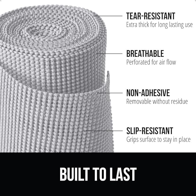 - EXTRA STRONG GRIP NON-ADHESIVE LINER: the Gorilla Grip powerGRIP liner is a non adhesive and tear resistant liner engineered with the highest quality materials to reduce slipping and bunching in your drawers or cabinet shelves; superior gripping technology keeps both the liner in place on surfaces
