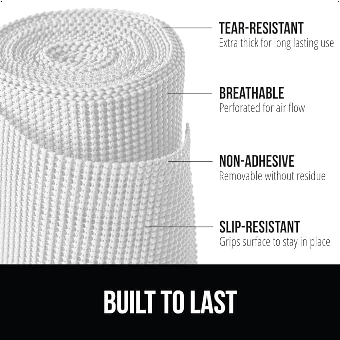- EXTRA STRONG GRIP NON-ADHESIVE LINER: the Gorilla Grip powerGRIP liner is a non adhesive and tear resistant liner engineered with the highest quality materials to reduce slipping and bunching in your drawers or cabinet shelves; superior gripping technology keeps both the liner in place on surfaces