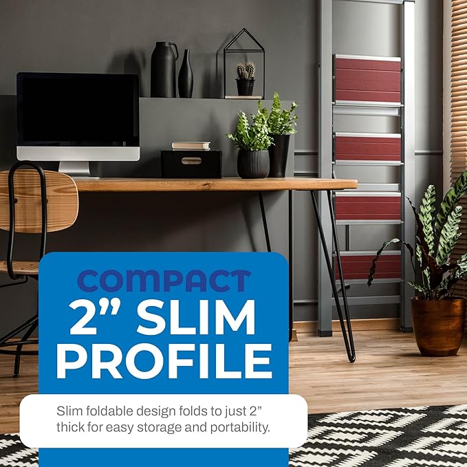- Slim, space-saving design lets you fold the ladder to a compact size for storage. Once folded, the step ladder is barely 2" thick offering easy, convenient storage in very narrow places, say goodbye to big, bulky ladders. Lightweight and a slim design makes transportation a breeze