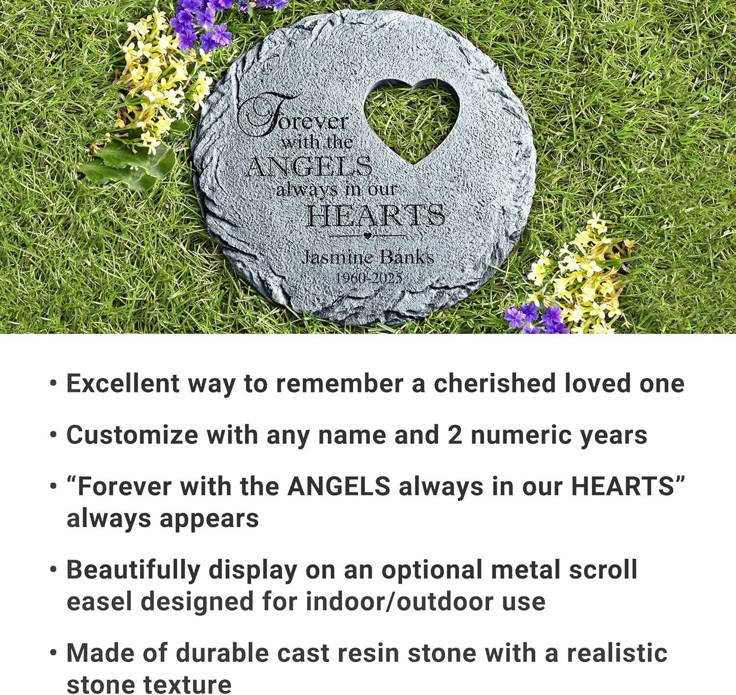 - UNIQUELY PERSONALIZED: Make their memory live forever. Customize your garden stone with their name laser-engraved up to 20 characters and 2 numeric years. “Forever with the Angels. Always in our Hearts" always appears.