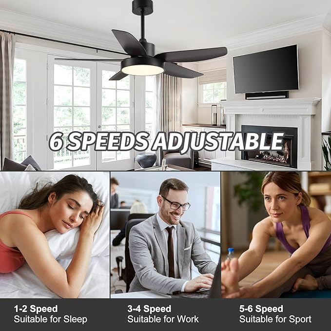 - REVERSIBLE & QUIET DC MOTOR: In summer, it can quickly cool down with air conditioning and is 75% more energy efficient than traditional ceiling fans; in winter, it can quickly warm up the room with heating airflow. Noise of black ceiling fans is less than 35dB