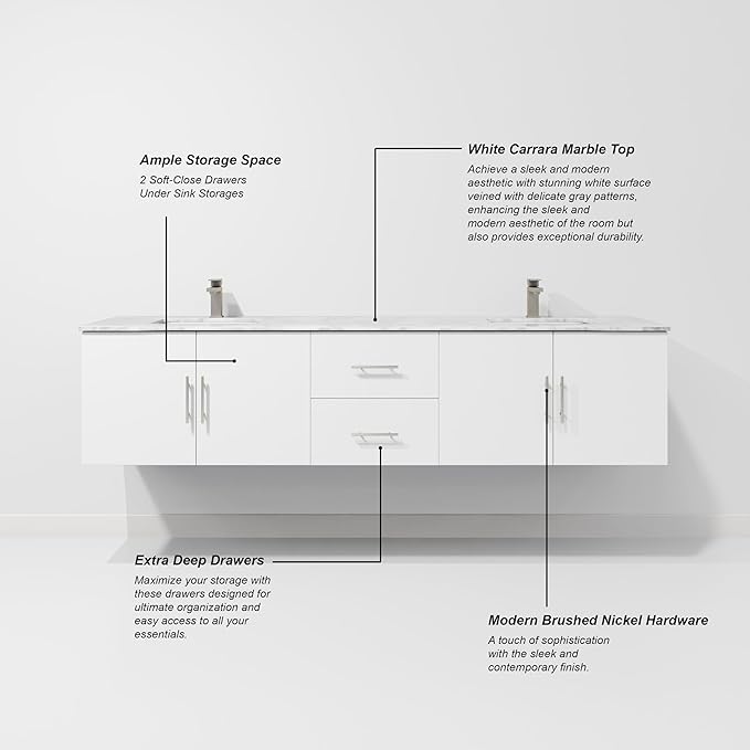 - Special Feature : Carrara Marble countertop included. Backsplash not included., Faucet not included, Glossy White finish, Vanity countertop has a scratch and stain resistant surface for lasting durability, Vanity countertop is pre-drilled for a single-hole faucet for easy installation Carrara Marble countertop included. Backsplash not included., Faucet not included, Glossy White finish, Vanity countertop has a scratch and stain resistant surface for l… See more