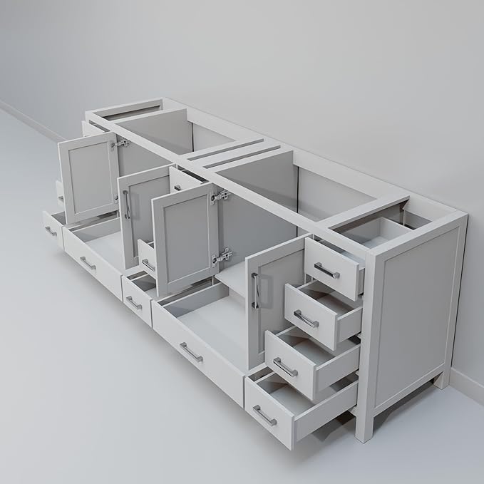 - Cabinet dimensions are 83 in W x 22 in D x 33.5 in H, Fully assembled vanity cabinet for quick and easy installation