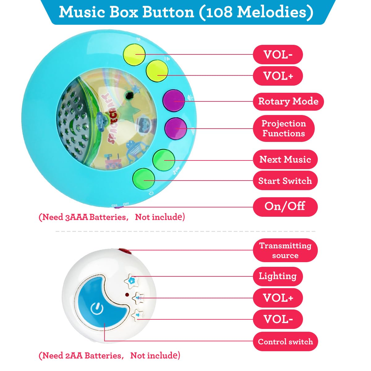 - Design and Features: The 360 rotation mobile with a remote control, the remote can control all the function in music box. Four cute airplane pendants spin slowly can attract the baby’s attention, help to exercise baby's eyesight. The cute hanging pendant can be taken off as small rattle toys