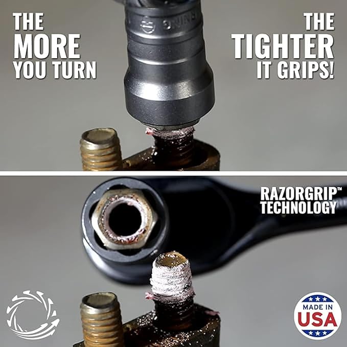 - Razorgrip Extraction Technology: Featuring exclusive Razorgrip helical teeth, the sockets grip tighter the more you turn, ensuring safe, fast, and slip-free extractions. This nut extractor socket set eliminates the risk of slipping and busted knuckles, delivering efficient performance every time.
