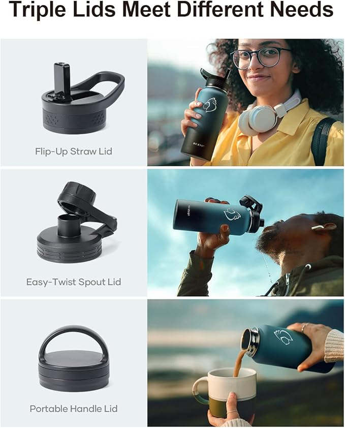 - 3 Caps Pack, 100% Leak-Proof: BUZIO stainless steel water bottle comes with 3 lids: portable handle lid, easy-twist spout lid, and flip-up straw lid to meet camping, hiking, cycling, fitness sports and more. Each lid has a thickened 360° seal for 100% leak-proof.