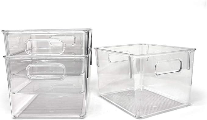 - CLEAR ORGANIZATION: Staying organized is easy with these non-slip medium-sized plastic storage bins. Goodbye cluttered fridge, messy desk, and household items that need to be tamed with a storage solution. These 3 matching bins are durable and can hold many loose items in one spot from baking supplies to beauty supplies. Each clear container makes it easy to see what’s inside, while the built-in handles and open top allow for quick access. Dimensions of each bin: 8.5” L x 7.5” W x 6” H, 0.9 lbs.