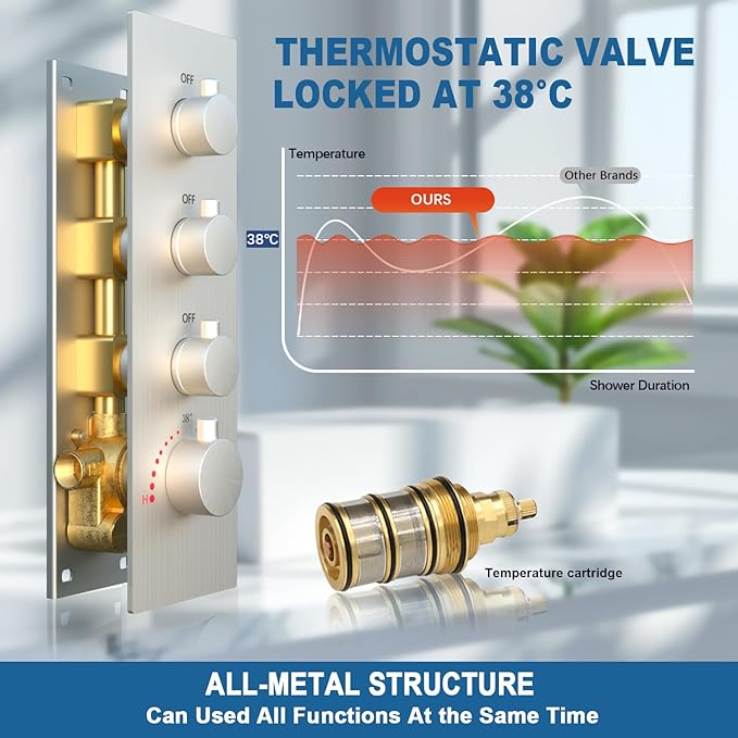 - ✔3-in-1 Diverter (can both together)+ Thermostatic Water Control Valve : Premium material and heavy duty, built with Solid Brass; 4 Round handles Design for effortless flow and temperature control, easy to operate. You can turn the knob to open rain shower head ,handheld showerhead and wall jets as you like; Besides, there is no worry since the unique structure inside the Pressure Balance Thermostatic Valve can monitor water temperature, keeping you safe from hot water.