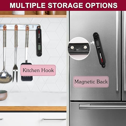 - Easy to use: Grill thermometer with foldable probe design, folds away easily and locks into base for portability; Magnetic back and hook allows for convenient storage
