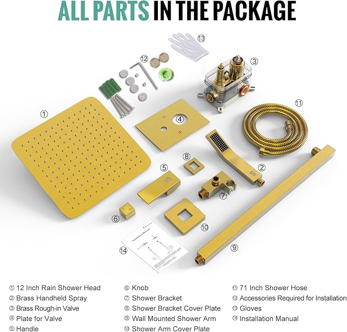 - You Will Get: 12 Inch Rain Shower Head(304 Stainless Steel), L-Style Hand Shower(Solid Brass), 16 Inch wall mounted shower arm(304 Stainless Steel), Rough-in Valve and Trims(Solid Brass), Shower Bracket(Solid Brass), 71 Inch Shower Hose(304 Stainless Steel) and Accessories Required for Installation.