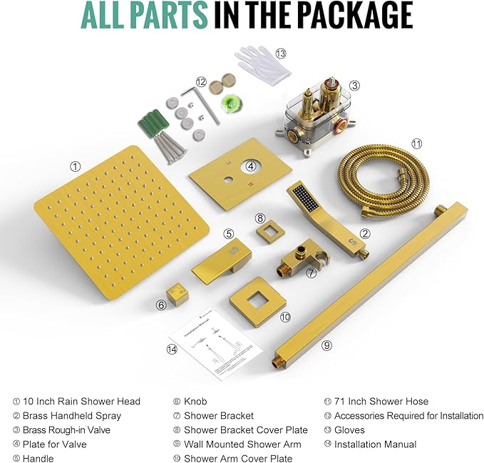 - Complete Shower System Included: This shower faucet set includes everything you need for a luxurious upgrade: a 10-inch rain shower head, a handheld shower head, a 71-inch shower hose, a 16-inch shower arm, a handheld bracket, a mixing valve, a panel, a handle, a mode knob, shower arm and bracket covers, and all necessary installation accessories.
