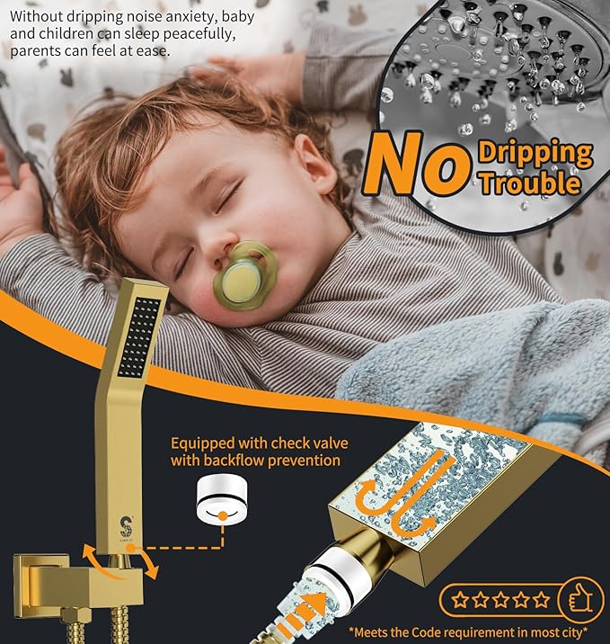 - Reliable Support & Certified Safety: Backed by 24/7 customer support, this Rain Shower Head and Handle Set ensures a stress-free experience. It features a cUPC certified pressure balance valve with built-in check valves to monitor water pressure and prevent scalding, approved by the California Energy Commission for standard 1/2-inch US pipe connections.