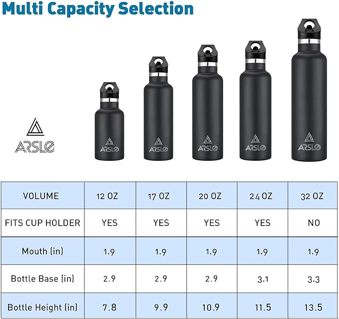 - MULTIPLE SIZE AND COLORS: Goodbye sweat ! Vacuum insulation with copper plating lining provide a better insulation condensartion. Vacuum stainless steel water bottle has multiple size (12 oz, 17 oz, 20 oz, 25 oz, 32 oz ) to meet your request with more than 10 colors. The anti-slip carbon coating surface ensucs a good grip and protect metal flask bottle from paint loss and any scratches. 12 oz, 17 oz, 20 oz, size fit in most coaster