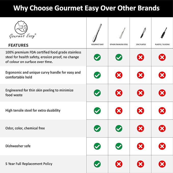 - GOURMET MADE SIMPLE: At Gourmet Easy, we're dedicated to simplifying gourmet cooking experiences. We believe that creating delicious meals for your loved ones should be a fun journey, not a daunting task. Share the joy of cooking with your loved ones with our Gourmet Easy Peeler!