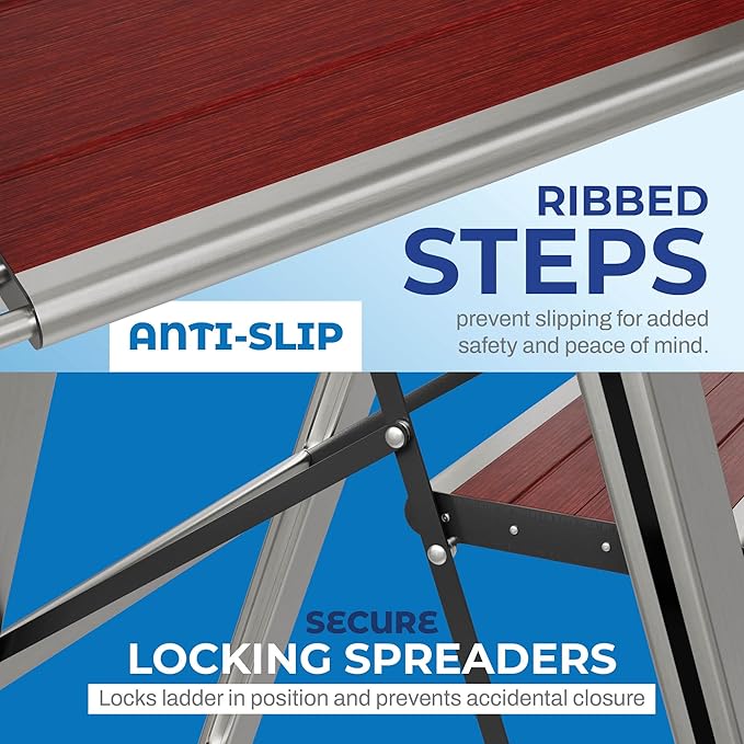 - Anti-slip ribbed steps for added security and slipping prevention, the steps are made from high quality brushed aluminum, providing strength and style. Rubberized feet keep the ladder from slipping and prevents your floor from getting scratched during use. Extra-large, oversized top platform provides a safe, stable and comfortable place to stand and eliminates fatigue