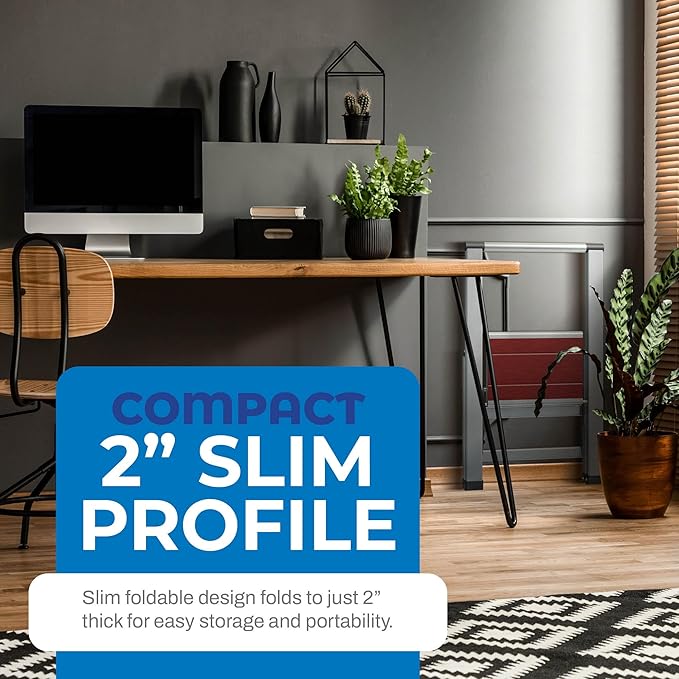 - Slim, space-saving design lets you fold the ladder to a compact size for storage. Once folded, the step ladder is barely 2" thick offering easy, convenient storage in very narrow places, say goodbye to big, bulky ladders. Lightweight and a slim design makes transportation a breeze