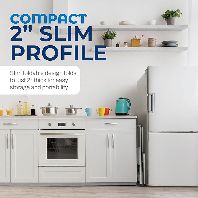 - Anti-slip ribbed steps for added security and slipping prevention, the steps are made from high quality brushed aluminum, providing strength and style. Rubberized feet keep the ladder from slipping and prevents your floor from getting scratched during use. Extra-large, oversized top platform provides a safe, stable and comfortable place to stand and eliminates fatigue