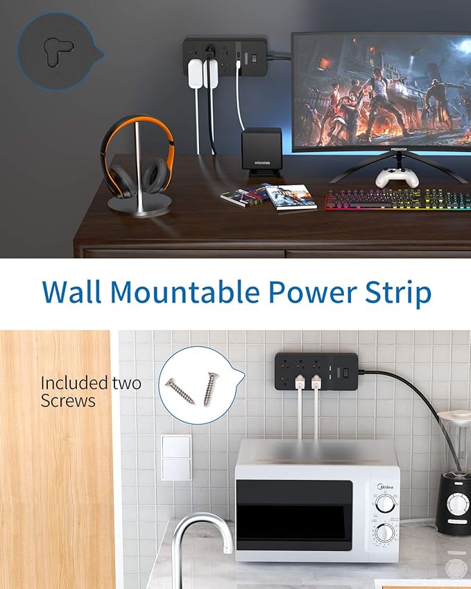 - 【Wall Mount Power Strip with Design Around Details】 - The low profile flat 180°rotating main plug easily fits in tight spaces like behind couch, dresser, bookshelves or other furniture which is close to the wall not allowing you to use the standard Plug. 2 mounting holes on the back allows you to install this mountable power strip in various applications, including workbenches, desk, wallmounts, under counters, dorm room & more, saving desktop space for you.