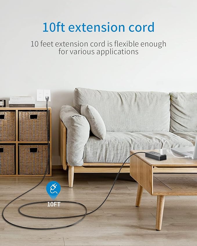 - 【Flat Cord Power Strip Extension Cords 10ft】 - The 10 ft flat extension cord is constructed of super thick copper integrated conductor, improve product transmission efficiency, durability and reduces heat build up. The white extension cord 10ft gives you flexibility to reach distant outlets and hard to reach places. A perfect solution for when power outlets are not conveniently located nearby.