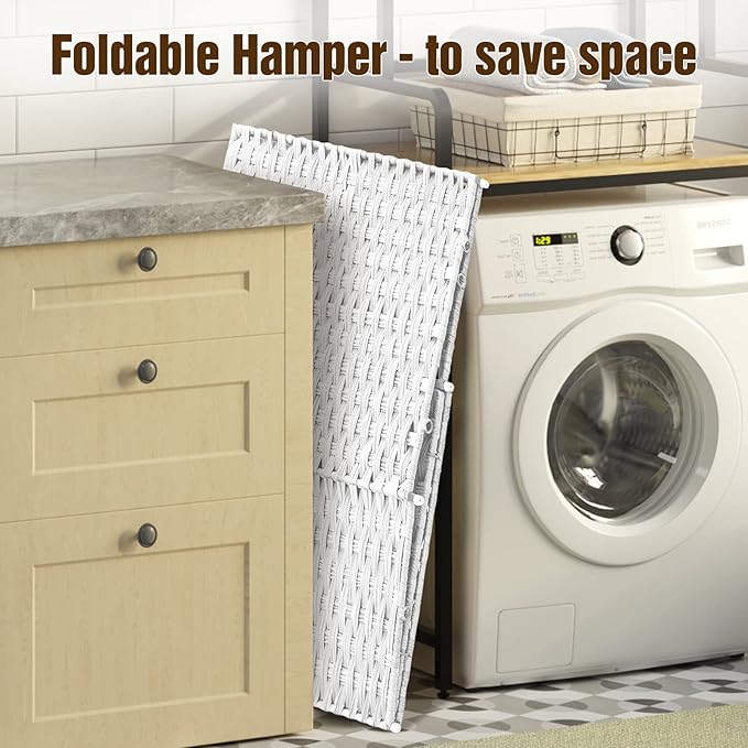 Greenstell Laundry Hamper with 2 Removable Liner Bags,90L Divided Clothes Hamper, Handwoven Synthetic Rattan Foldable Laundry Basket with Lid and Handles White (18.5 x 13.3 x 24.0Inches)
