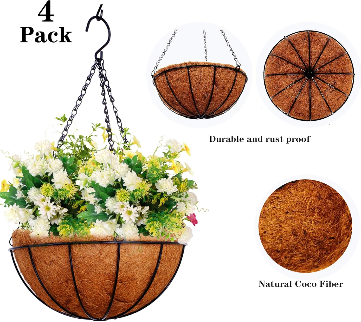 Hanging Baskets for Plants Outdoor(12 inch 4 Pack)- Coconut Coir Hanging Planters Outdoor,Metal Wire Baskets with Coco Liner, Hanging Pots for Plants Indoor, Flower Pots for Railings