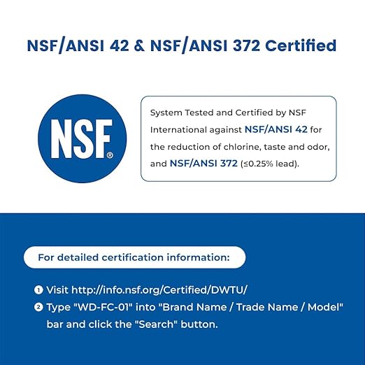 - NSF certifications: Tested and certified by NSF International against NSF/ANSI standard 42 for the reduction of chlorine, taste and odor, and to NSF/ANSI 372 for lead-free material. Provides you with safer and healthier water. โญPlease Note: This system DOES NOT lower TDS value. If you want to decrease the TDS value, please choose Waterdrop RO system.โญ