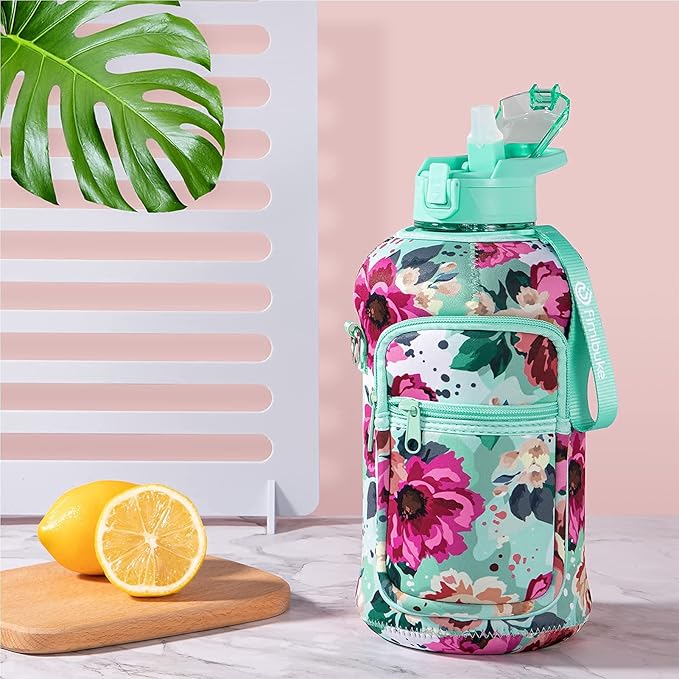 Fimibuke Half Gallon Water Bottle with Sleeve 64 OZ Water Bottle with Handle & Straw Leakproof Motivational Sports Gym Water Bottle with Time Marker BPA Free Water Jug with Reusable Neoprene Holder