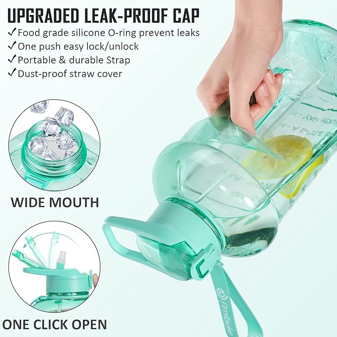 - HUMANIZED DESIGNS: Our 64 oz water bottle with straw is designed with a upgraded lid that ensures 100% leak proof and dust proof. Advanced one-click button makes you drink easier, just pushing the button and the straw will pops out automatically. You can enjoy spill-proof sipping with straw or fast water flow without lid. With a wide mouth, this big water bottle not only is easy to fit ice cubes and fruits, but very easy to clean, just need to simply wash it with Baking Soda and Vinegar.