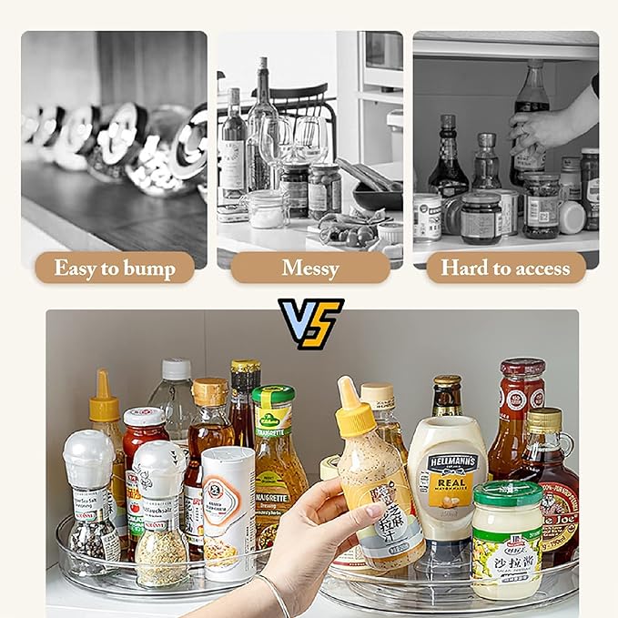 - 1. 360° Smooth Rotating:This Lazy Susan turntable has high-quality stainless steel bearings to make it glide smoothly. The steady base and raised side walls keep items secure when turning. Quickly get what you want, no longer rummaging.