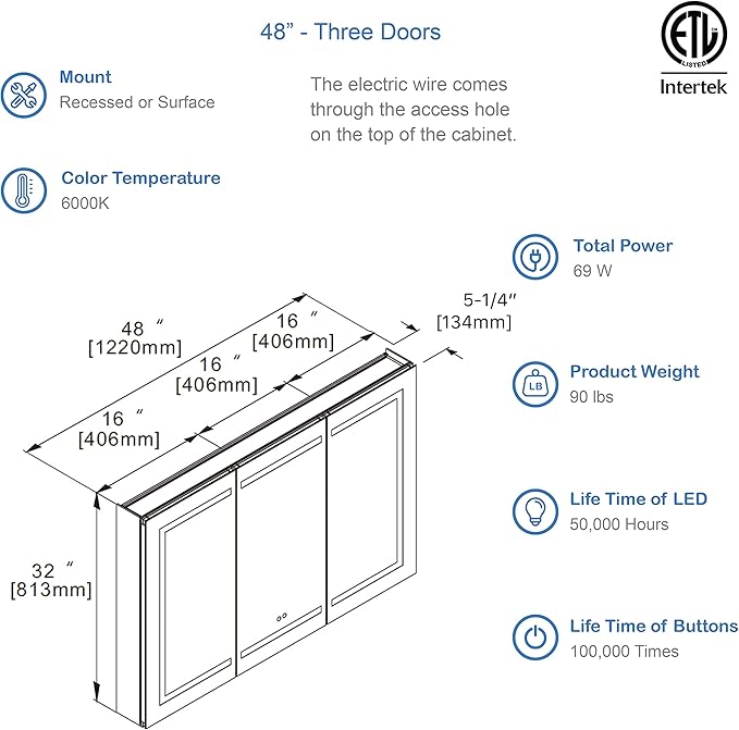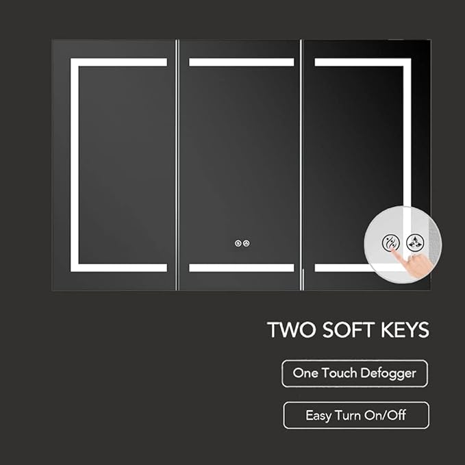 - Long-Lasting & High-Quality Build: Built for durability, this medicine cabinet mirror features LED lights with a 50,000-hour lifespan for years of reliable use. The soft-close hinge and concealed finger-pull door minimize noise and prevent slamming. With a 100,000 switch touch lifespan, the lighted bathroom medicine cabinet ensures long-term functionality and ease of use.