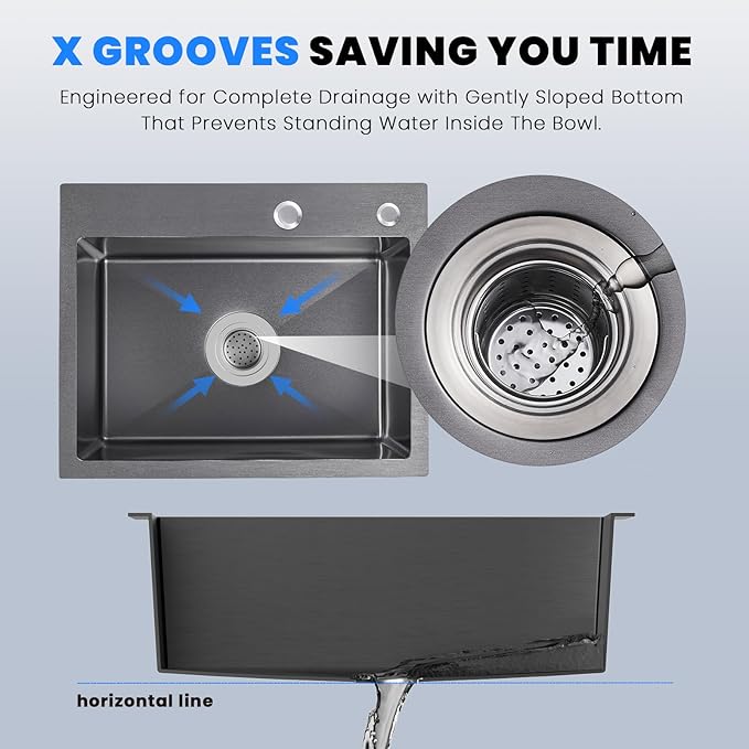 - 【Fast Drainage】The X groove is designed for easy drainage, the a slight dip at the bottom to prevent water accumulation. While 4 drain grooves on the sloped bottom of the sink help direct water to the drain